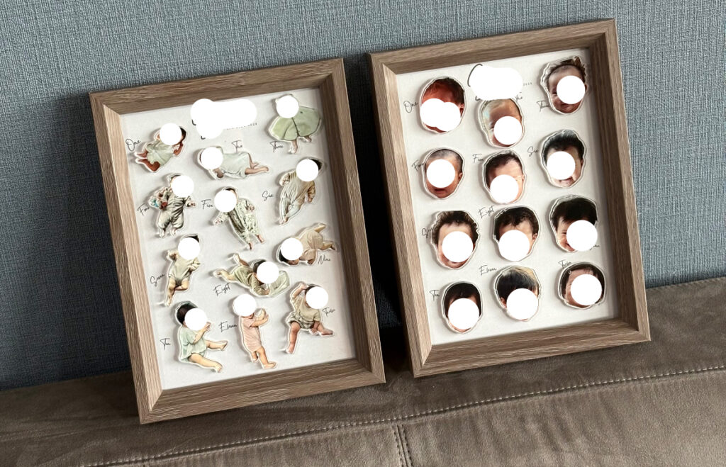 100均のフォトフレームに娘の名前と何ヶ月かをレイアウトしたシートを敷き、プレートを順番に並べました。