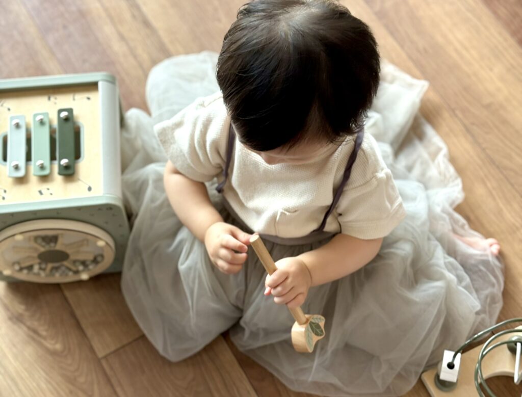 型はめ、迷路、回転遊びなどさまざまな指先知育アクティビティが詰まっているのですが、なかでも娘が気に入ったのは鉄琴。付属のバチでカンカン叩き、音を楽しんでいました。