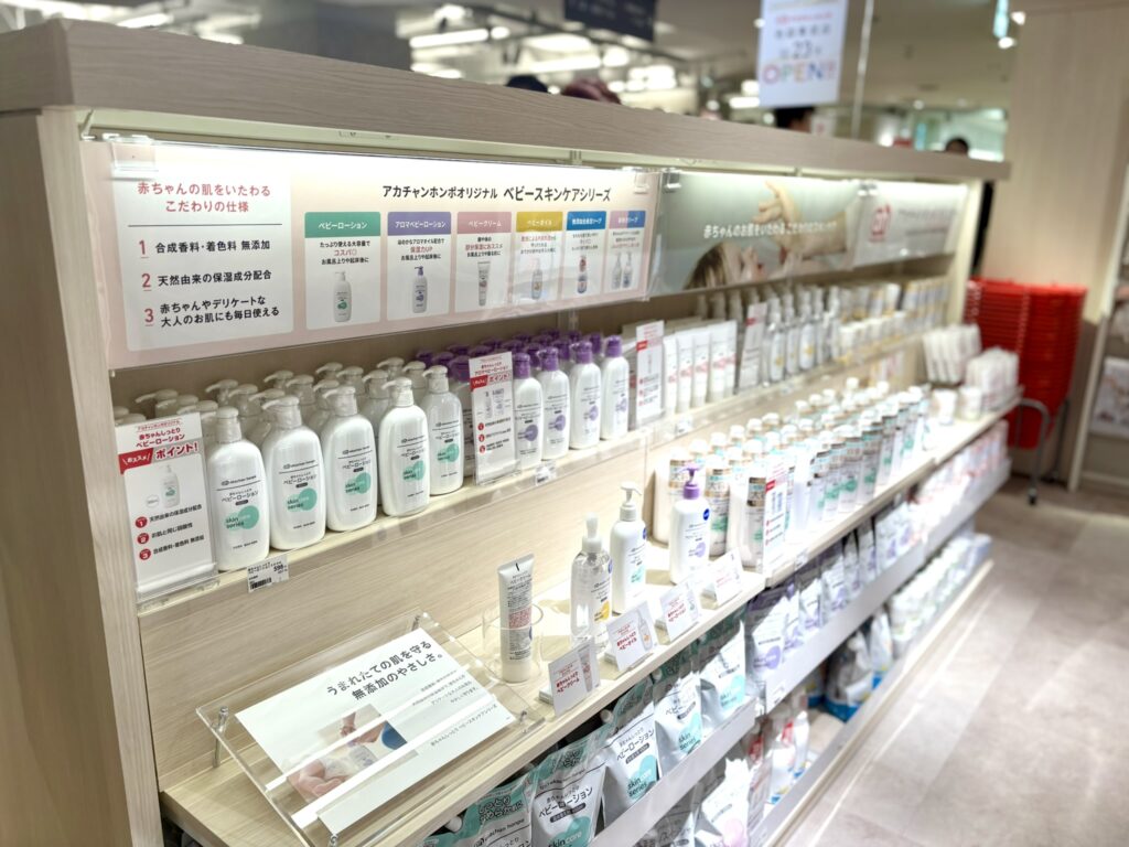 百貨店内のわりには思ったより広く、陳列棚もゆったりしていてベビーカーでも見やすい。オープン日だったこともあってかレジには40人ほどの行列ができていましたが、売り場はそれほど混んでいませんでした。